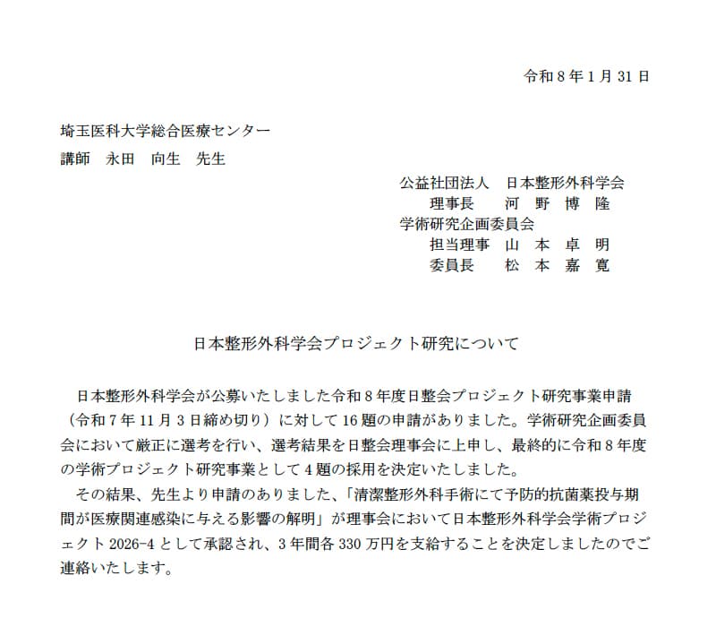 本施設が機関となっている「清潔整形外科手術にて予防的抗菌薬投与期間が医療関連感染に与える影響の解明」が令和8年度日整会プロジェクト研究事業2026-4として採択されました。本研究は前向き比較研究であり、患者さまのリクルートは2026年夏頃から始まる予定です、共同研究機関と協力して進めてまいります。